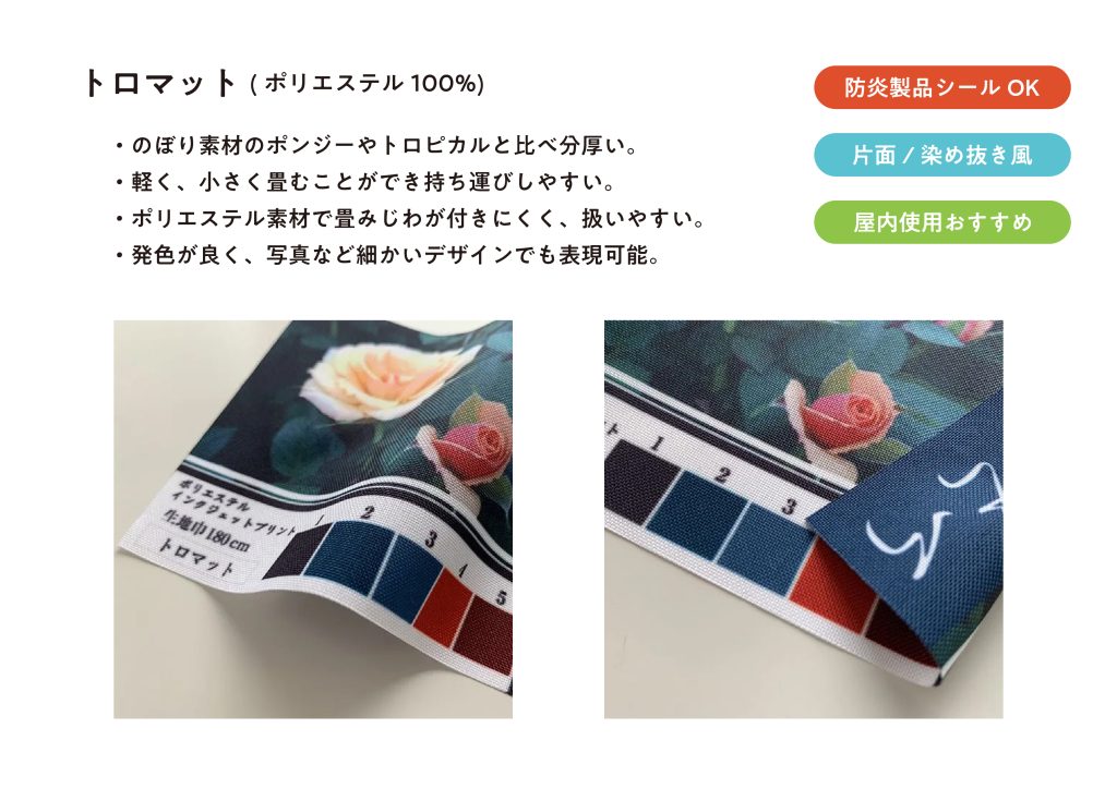雨に強い「撥水トロマット」、トロマット生地よりも少し厚い「厚手トロマット」や両面別柄で印刷可能な「遮光ターポリン」なども取り扱いございます。