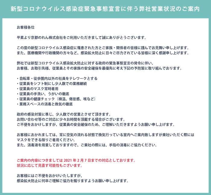 新型コロナウイルス感染症緊急事態宣言に伴う弊社営業状況のご案内