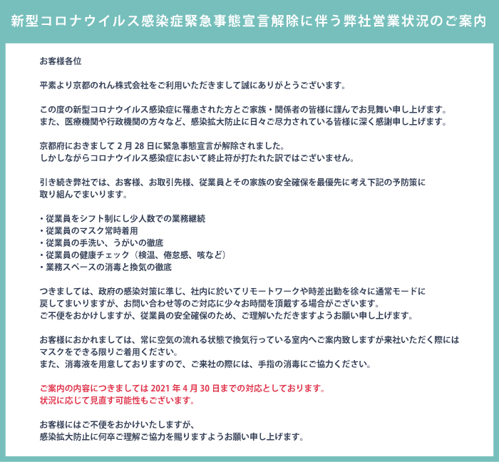 新型コロナウイルス感染症緊急事態宣言延長に伴う弊社営業状況のご案内